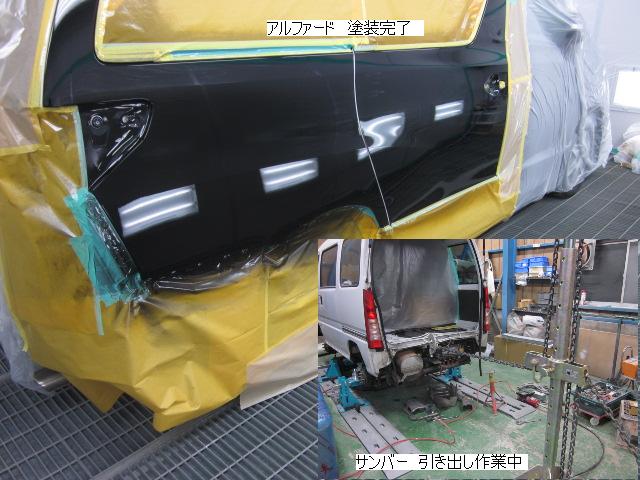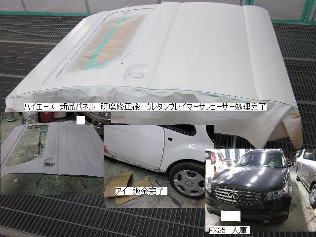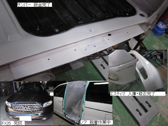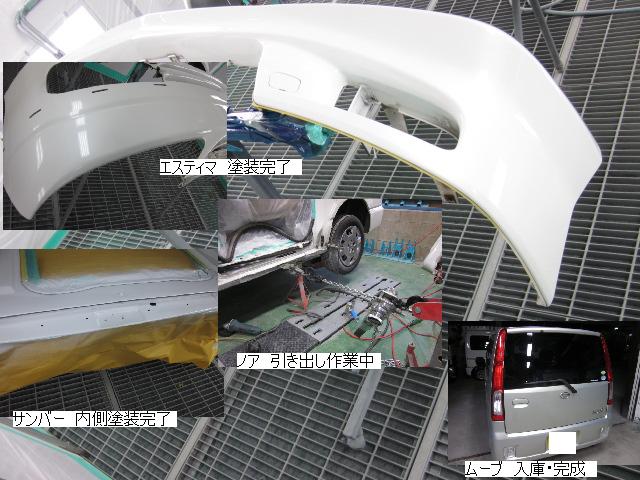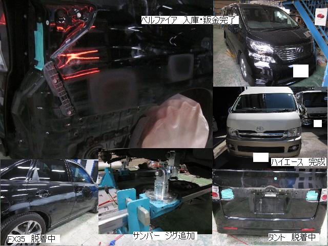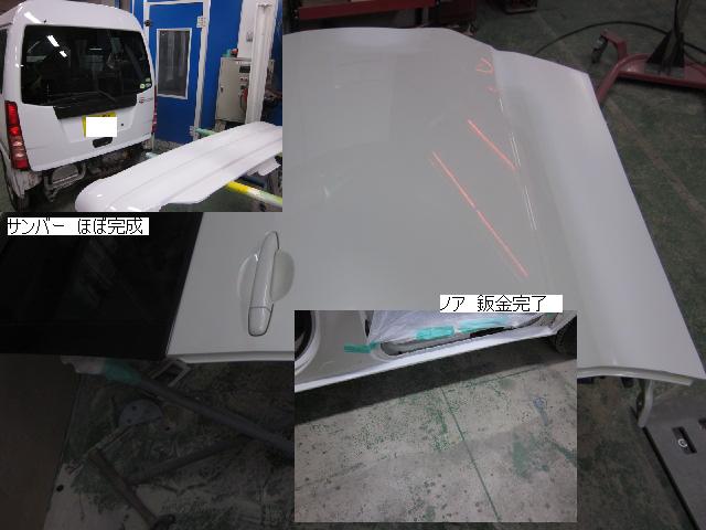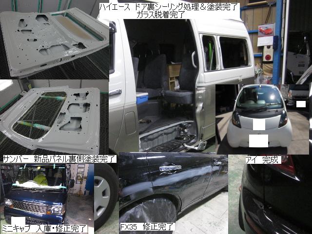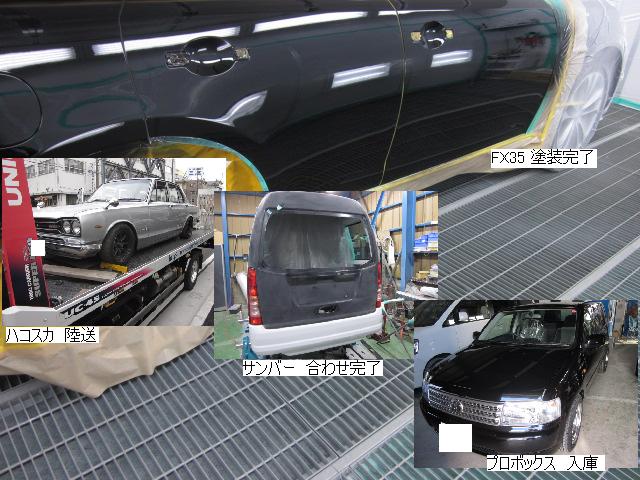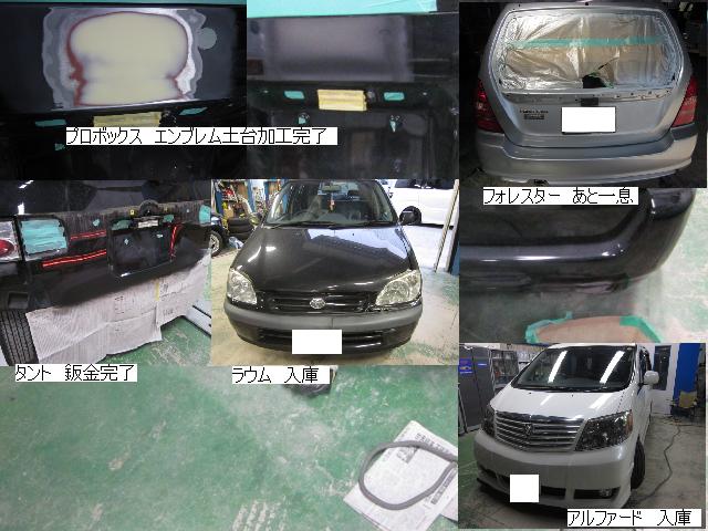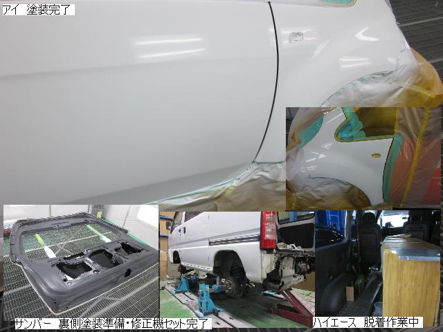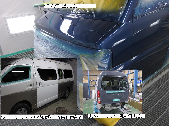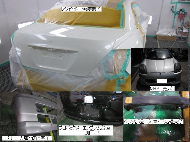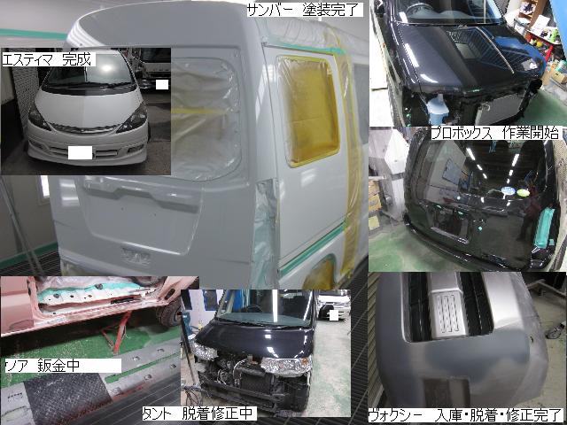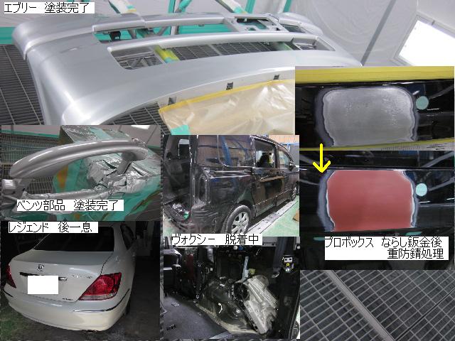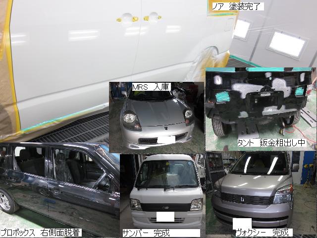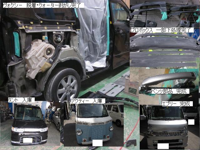 エブリー=本日磨き・組み付け完了し、完成しました。 エルグランド=本日外注先より戻ってきて、完成です。 ヴォクシ-=スライドドア脱着とクォ-ターの剥がし作業まで完了しました。部品待ちです。 プロボックス=一部下処理を進めています。部品点数が多く置き場がないので、細かいものを先に塗装して倉庫に保管します。 ベンツ部品=本日完成しました。ご足労ありがとうございました。 レガシー=保留中ですが、最終的に修理しますのでとりあえず脱着作業を進めています。 タント=入庫しました。対物保険対応で、保険会社連絡後の作業開始となります。 アクティー=入庫しました。フレンチバス仕様でこちらも対物保険対応で、保険会社連絡後の作業開始となります。 車のキズ(傷)・ヘコミの修理・板金(鈑金)・塗装の専門店、神奈川県相模原市の有限会社シバボディー まずはお問い合わせフォームへ! 対物保険・車両保険・各種保険修理対応。保険修理には特別サービス有り! 中古部品を使った格安修理にも対応致します。 対応地域・・・町田市、相模原市、横浜市、大和市、海老名市、綾瀬市、その他